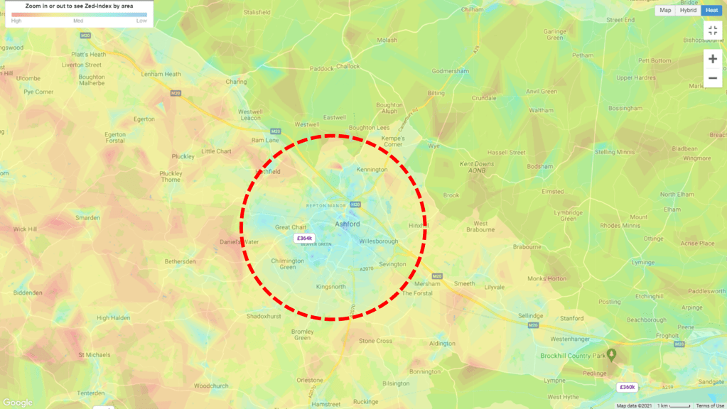 I have come across some excellent heatmaps demonstrating how affordable Ashford is in comparison with surrounding areas. The map below illustrates this; the darker shaded areas reflect a higher price and Ashford really does stand out!