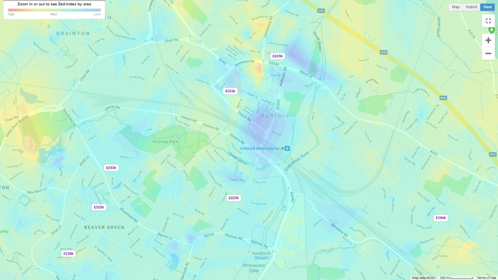 What makes this particularly interesting is how, when you zoom in, it appears that properties around Ashford International Station are slightly cheaper than areas further out. This is an interesting statistic as it is often the other way round!