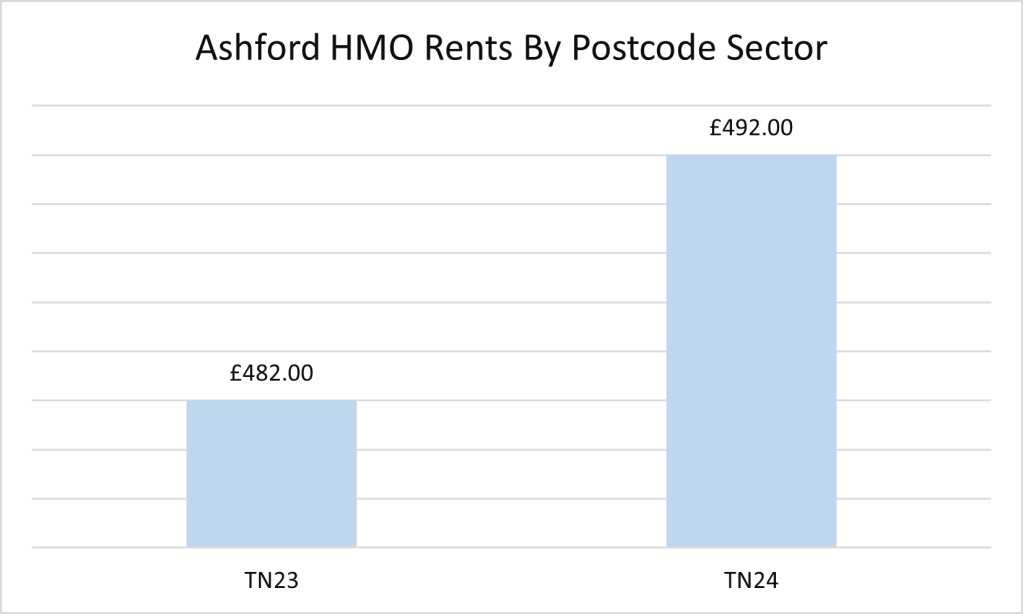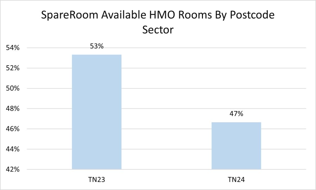 Whilst an overall small number, what is interesting to see is how there is a relatively even split of available rooms between the two postcode sectors. TN23 and TN24 cover Ashford town centre, which would be why there is this relatively even split.