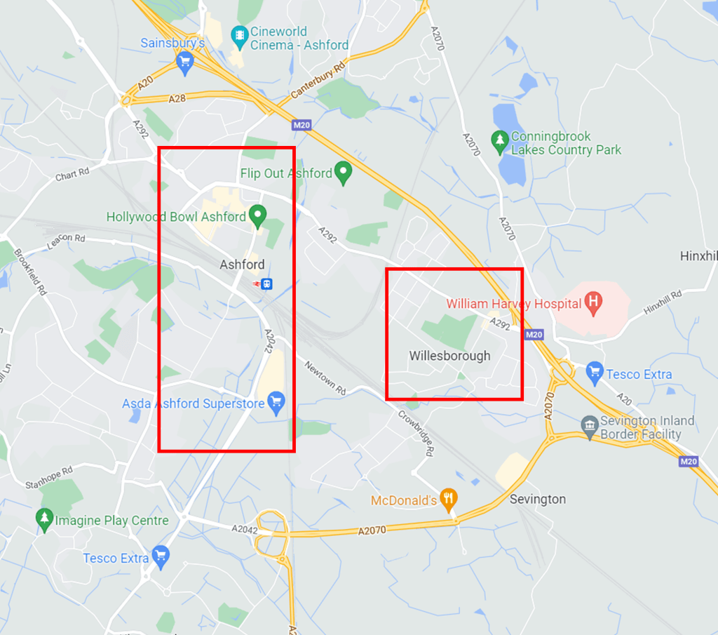 I have been working on an investment map for Ashford and am exclusively sharing these with you! I must stress these are suggested areas to focus your search upon. It does not mean that a property will not work if it is outside of the square, however it is worth focusing your search within the red square itself.